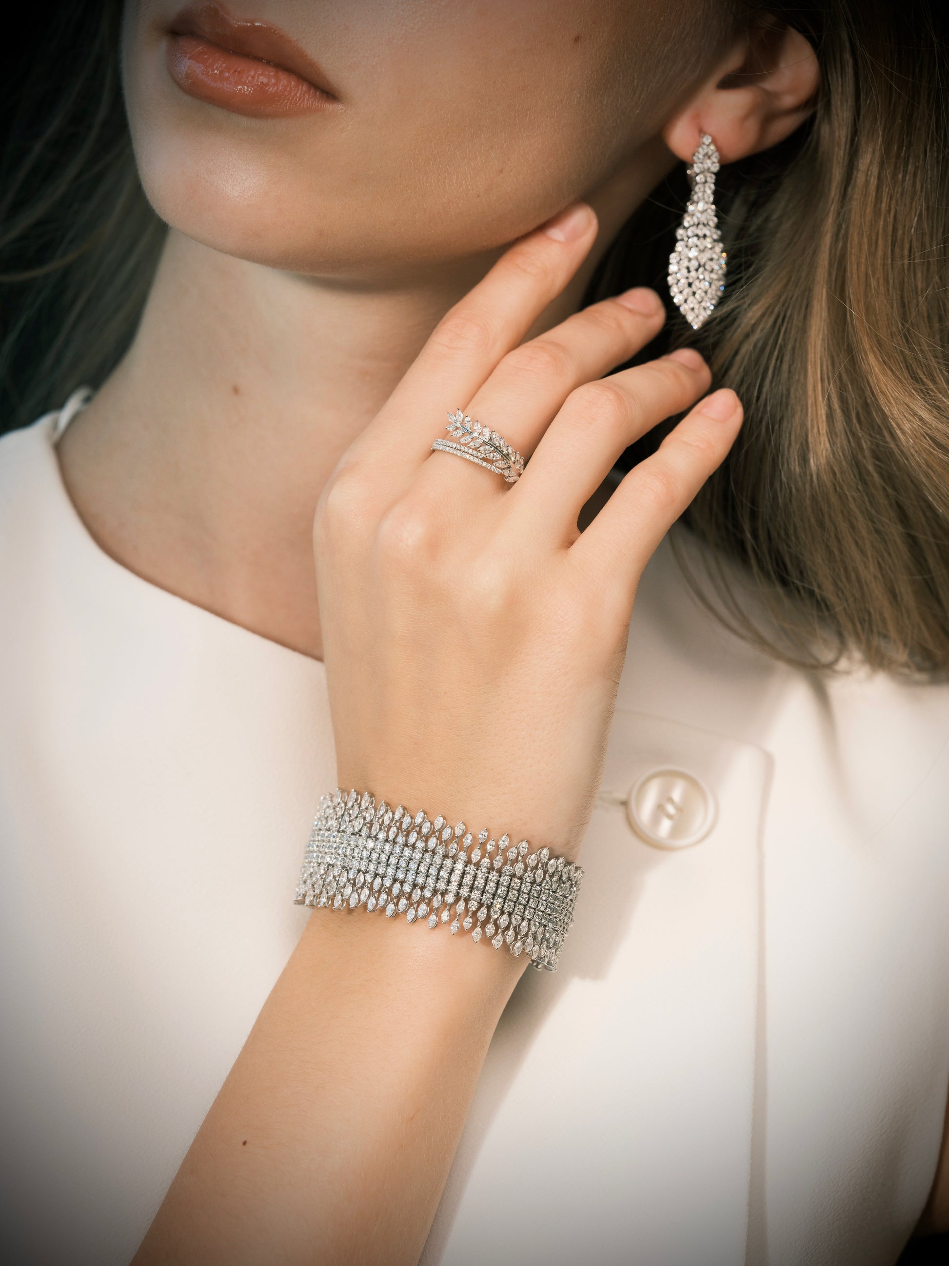 Wearing long dangling diamond earrings can symbolize elegance, confidence, and a touch of extravagance. These earrings are often associated with special occasions—such as galas, weddings, or high-end events—where their movement and shine add a layer of glamour.