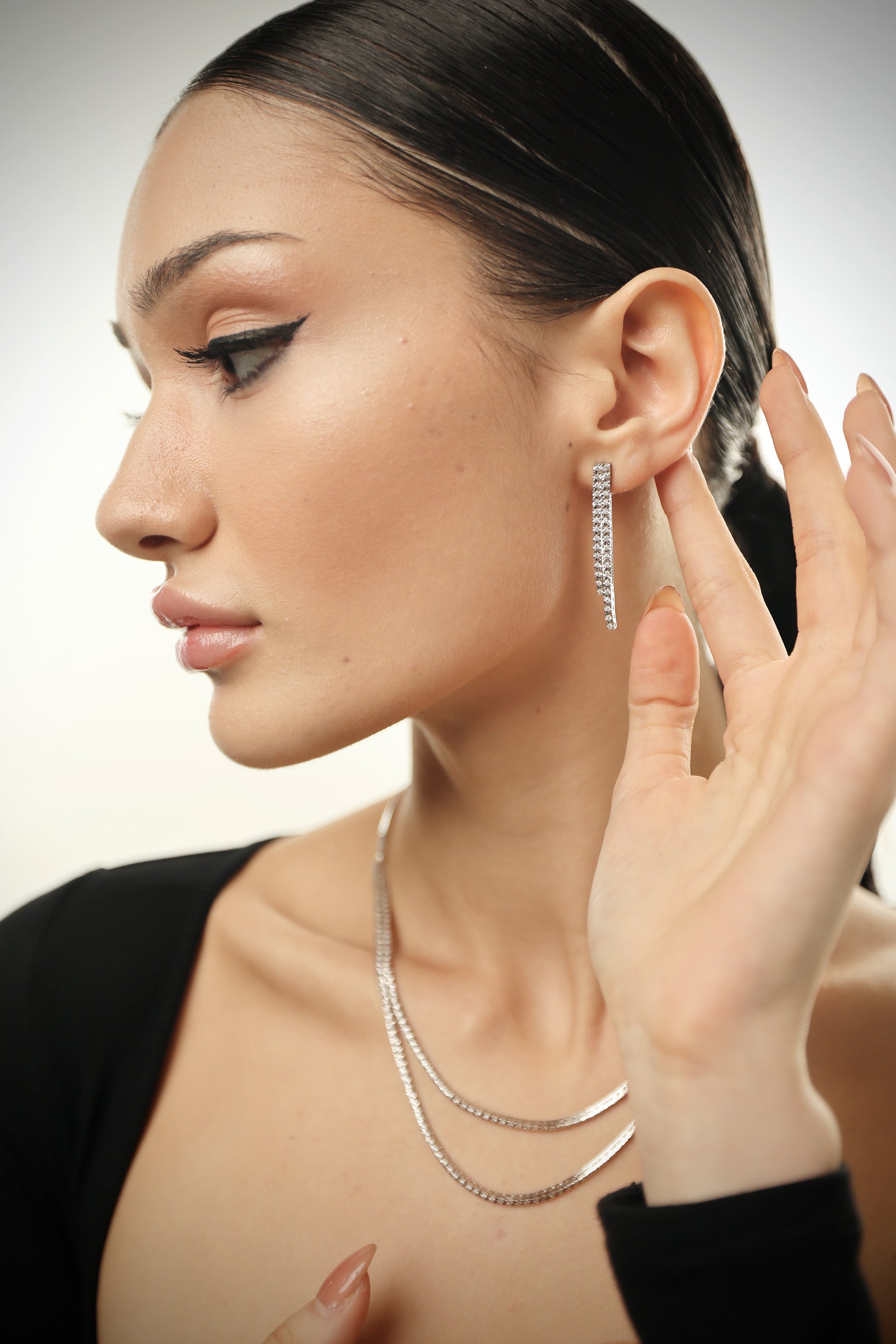 The Round Diamond Double Line Earring features a modern and elegant design with two parallel rows of round diamonds that frame a central, brilliant diamond. This double-line structure enhances the overall sparkle and creates a sophisticated, multi-dimensional look. Crafted with precision, the earrings combine contemporary flair with timeless beauty, making them a versatile piece suitable for both special occasions and everyday elegance. The high-quality gold setting further elevates the luxury of this design, offering both durability and a refined finish.
